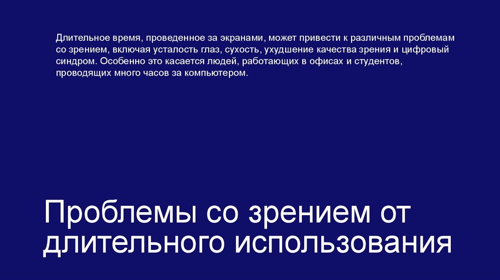 Длительное время, проведенное за экранами, может привести к различным проблемамсо зрением, включая усталость глаз, сухость, ухудшение качества зрения и цифровый