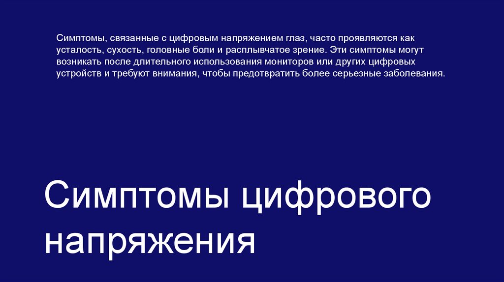 Симптомы, связанные с цифровым напряжением глаз, часто проявляются какусталость, сухость, головные боли и расплывчатое зрение. Эти симптомы могут
