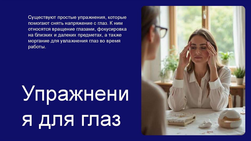 Существуют простые упражнения, которыепомогают снять напряжение с глаз. К ним
