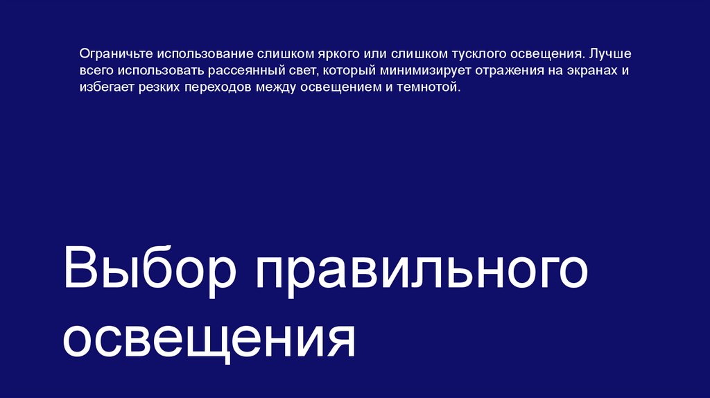 Ограничьте использование слишком яркого или слишком тусклого освещения. Лучшевсего использовать рассеянный свет, который минимизирует отражения на экранах и