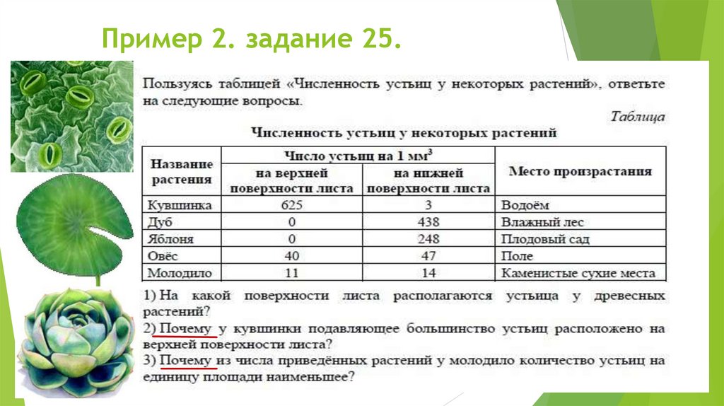 2) кувшинка – водное растение. Верхняя поверхность листа соприкасается с воздухом, а нижняя