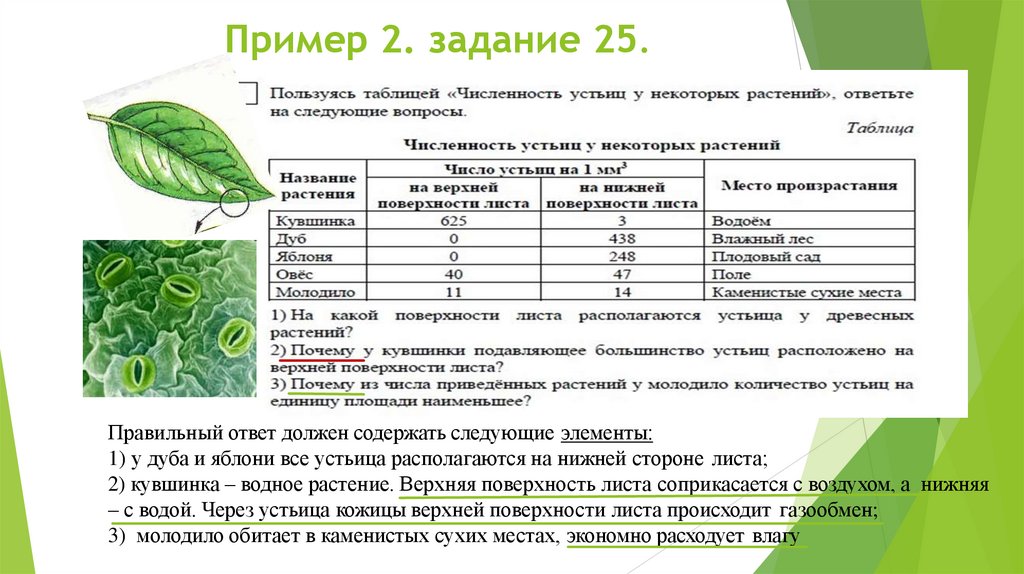 Правильный ответ должен содержать следующие элементы:1) у дуба и яблони все устьица располагаются на нижней стороне листа;