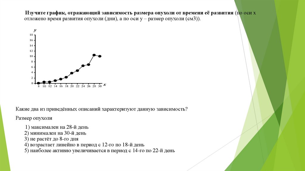 Изучите график, отражающий зависимость размера опухоли от времени её развития (по оси xотложено время развития опухоли (дни), а по оси y – размер опухоли (см3)).