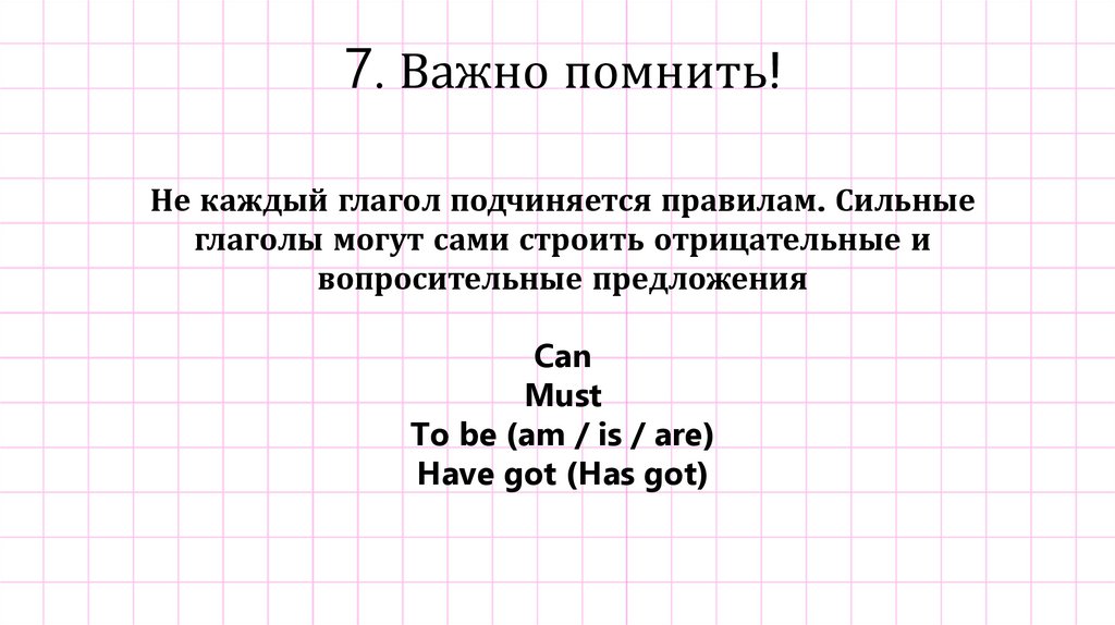7. Важно помнить!Не каждый глагол подчиняется правилам. Сильные
