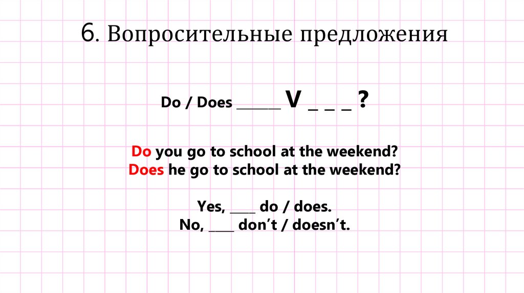 6. Вопросительные предложенияDo / Does _______ V _ _ _ ?