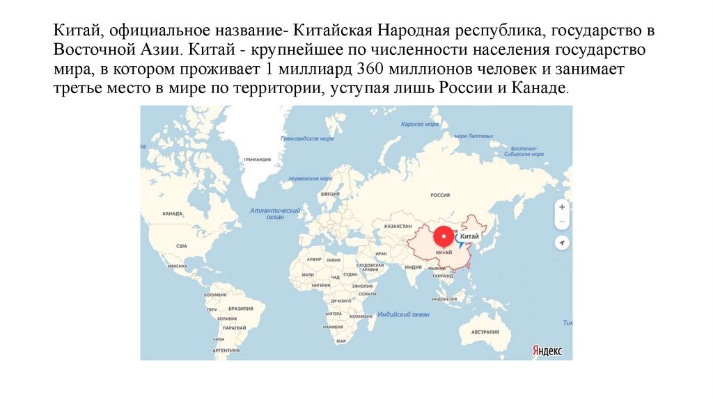 2. Китай, официальное название- Китайская Народная республика, государство в Восточной Азии. Китай - крупнейшее по численности
