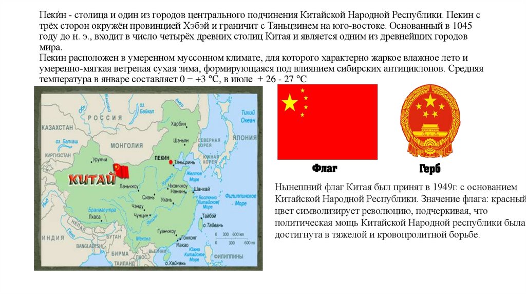 3. Пеки́н - столица и один из городов центрального подчинения Китайской Народной Республики. Пекин с трёх сторон окружён