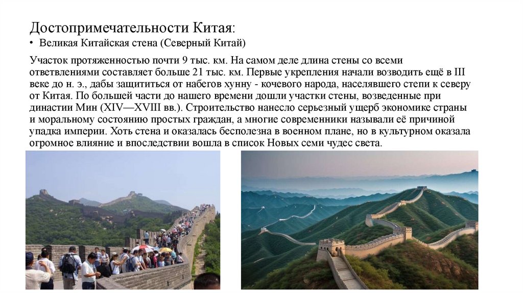 • Великая Китайская стена (Северный Китай)Участок протяженностью почти 9 тыс. км. На самом деле длина стены со всеми