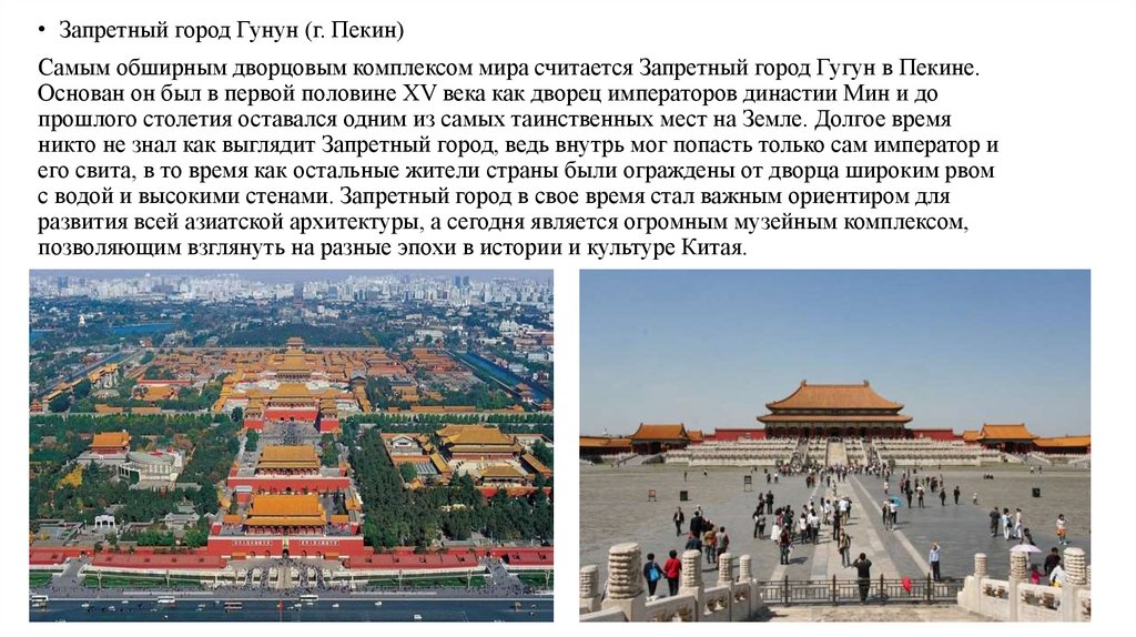 • Запретный город Гунун (г. Пекин)Самым обширным дворцовым комплексом мира считается Запретный город Гугун в Пекине.
