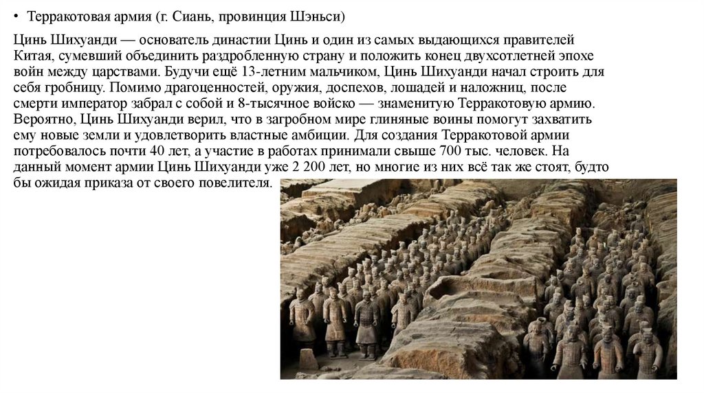 • Терракотовая армия (г. Сиань, провинция Шэньси)Цинь Шихуанди — основатель династии Цинь и один из самых выдающихся правителей