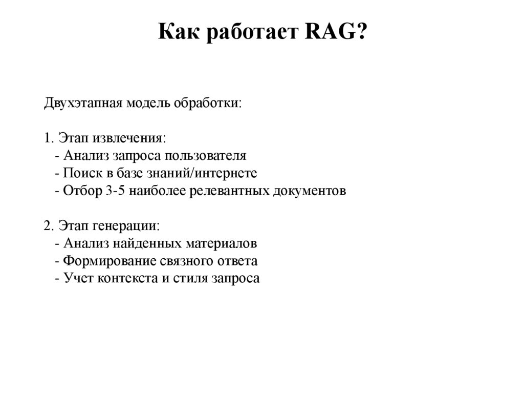 • Комбинирует два ключевых процесса: поиск информации и генерацию