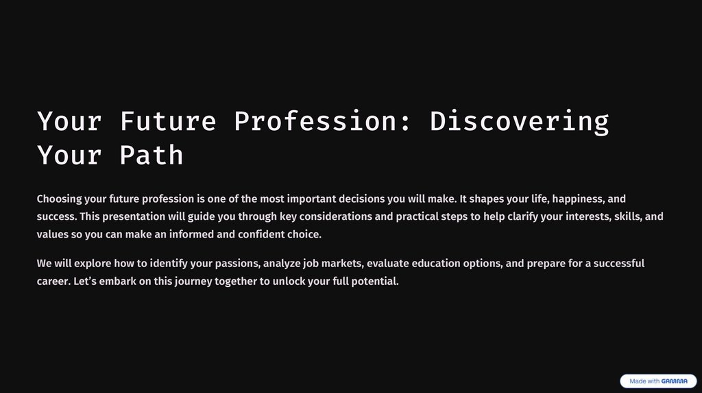 success. This presentation will guide you through key considerations and practical steps to help clarify your interests, skills, and