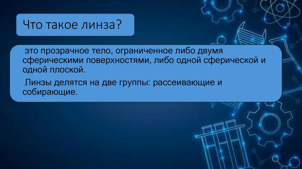 это прозрачное тело, ограниченное либо двумясферическими поверхностями, либо одной сферической и