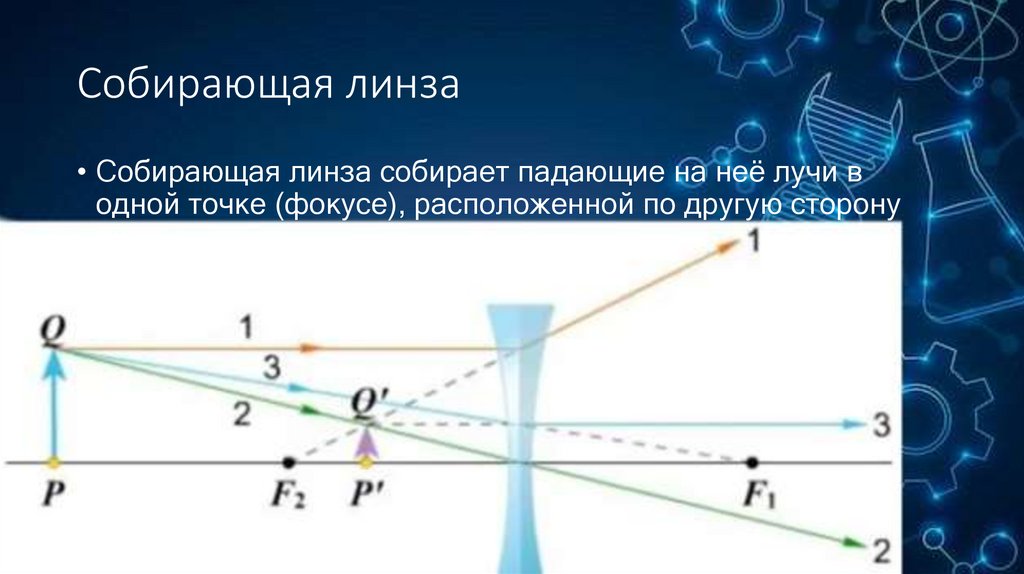 • Собирающая линза собирает падающие на неё лучи водной точке (фокусе), расположенной по другую сторону