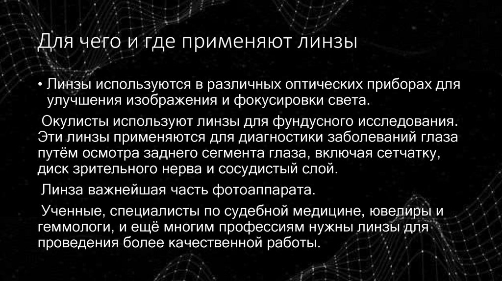• Линзы используются в различных оптических приборах дляулучшения изображения и фокусировки света.