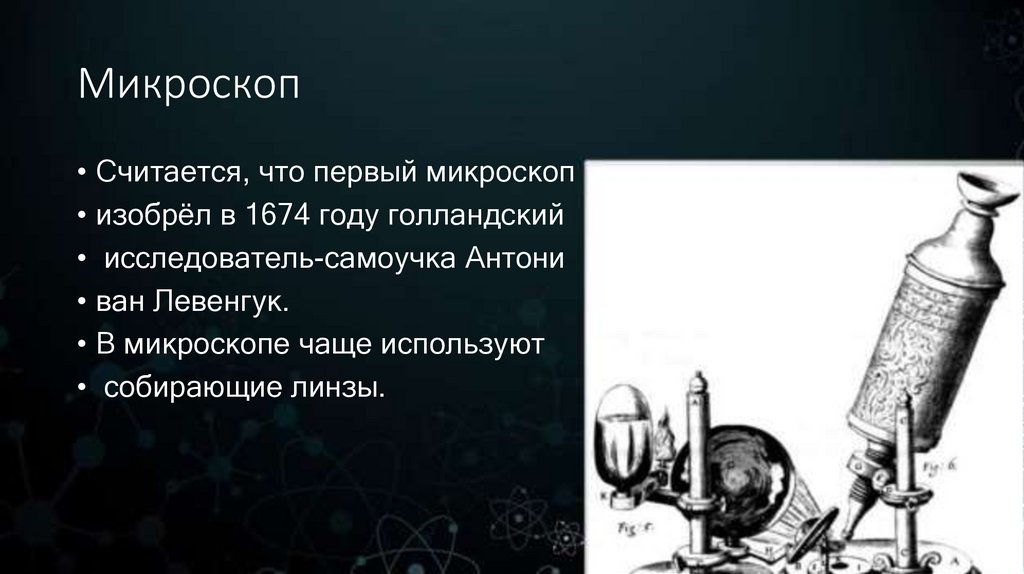 • Считается, что первый микроскоп• изобрёл в 1674 году голландский