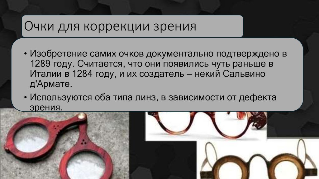 • Изобретение самих очков документально подтверждено в1289 году. Считается, что они появились чуть раньше в