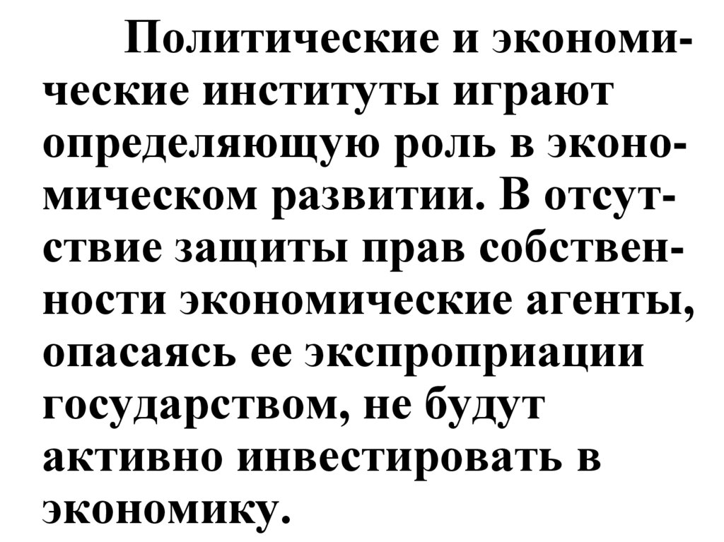 Политические и экономические институты играютопределяющую роль в экономическом развитии. В отсутствие защиты прав собственности экономические агенты,
