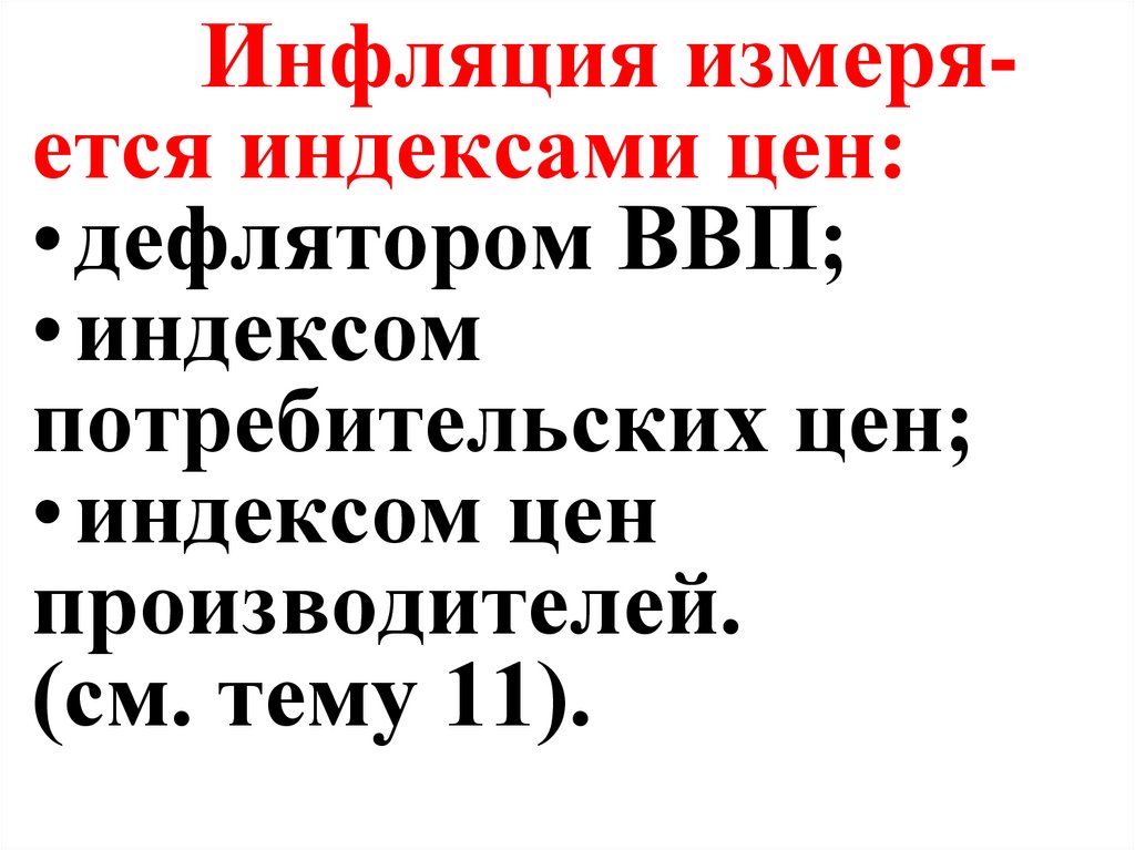 Инфляция измеряется индексами цен:•дефлятором ВВП;