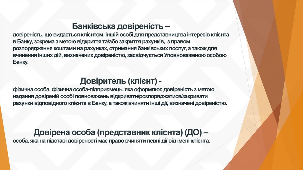 Банківська довіреність –довіреність, що видається клієнтом іншій особі для представництва інтересів клієнта