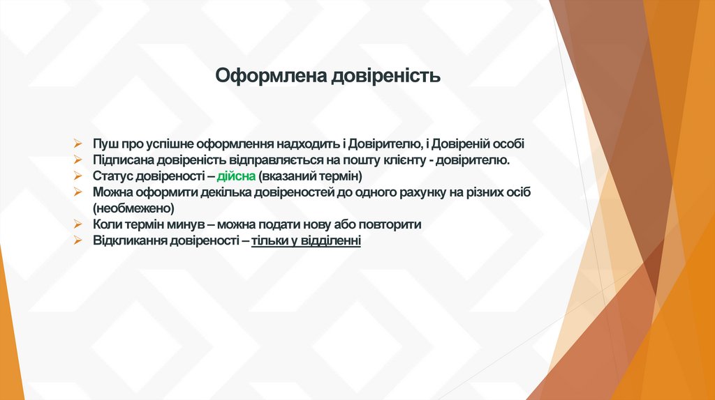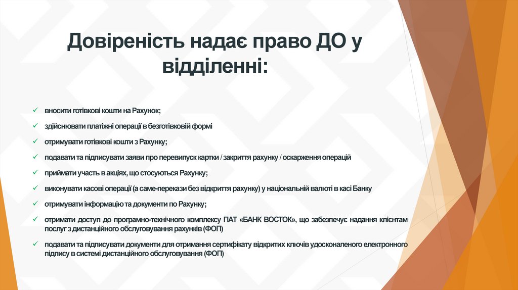 рахунки відповідного клієнта в Банку, а також вчиняти інші дії, визначені довіреністю.