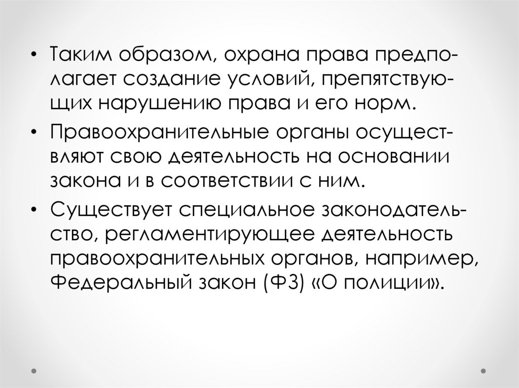 • Таким образом, охрана права предполагает создание условий, препятствующих нарушению права и его норм.• Правоохранительные органы осуществляют свою деятельность на основании
