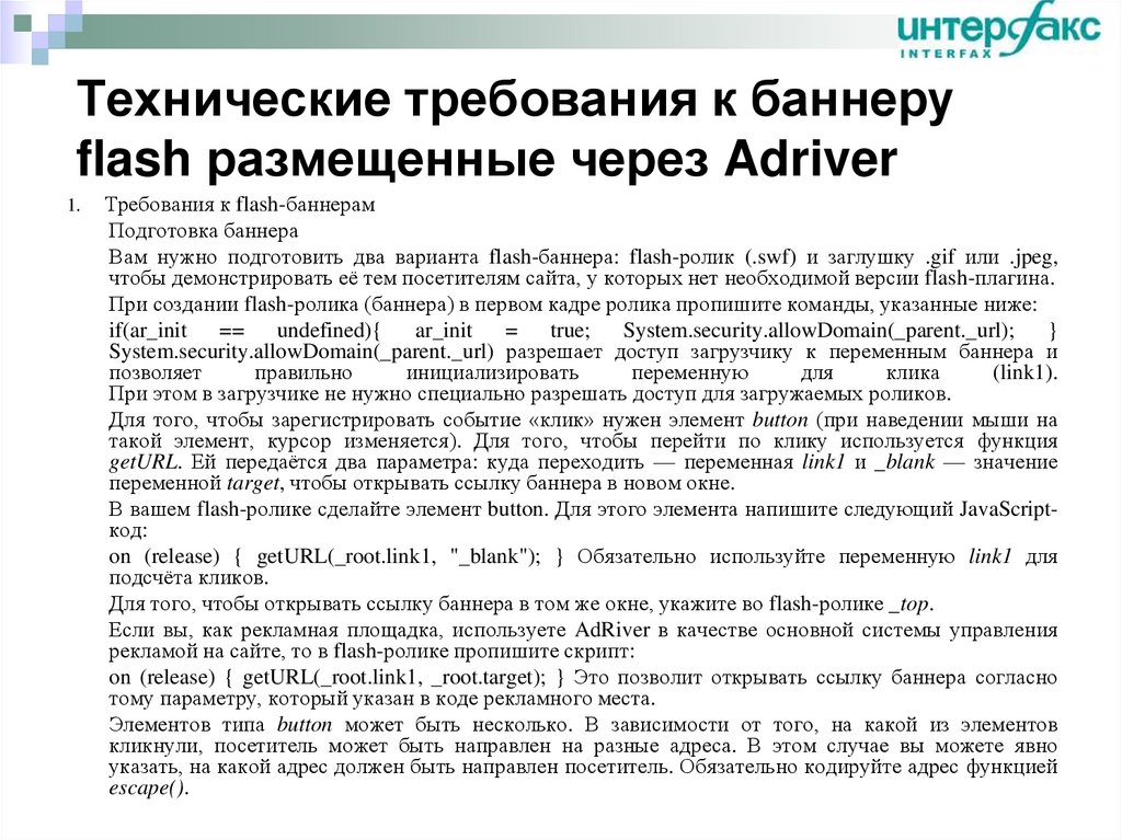 14. Технические требования к баннеру flash размещенные через Adriver