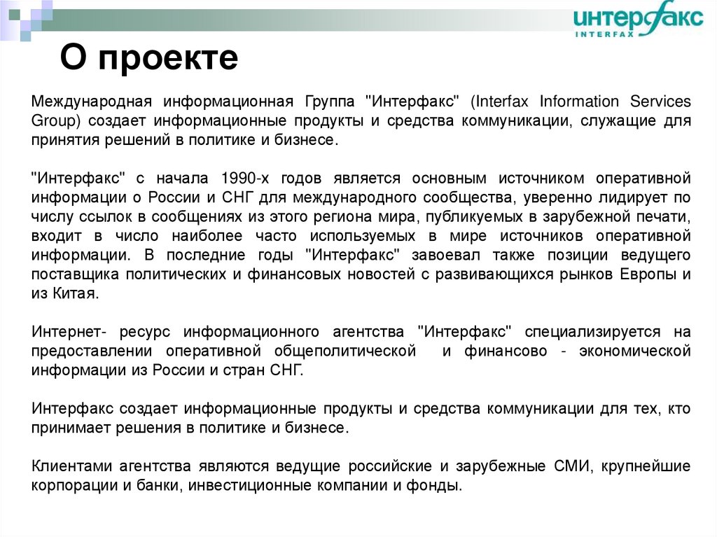 О проектеМеждународная информационная Группа "Интерфакс" (Interfax Information Services