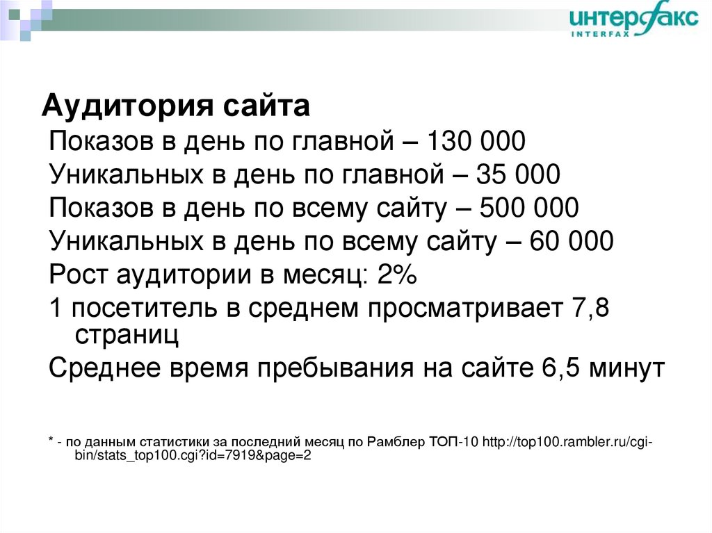 Показов в день по главной – 130 000Уникальных в день по главной – 35 000