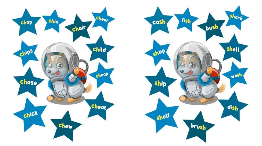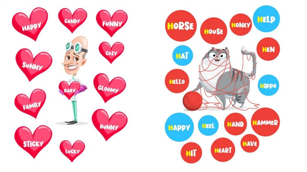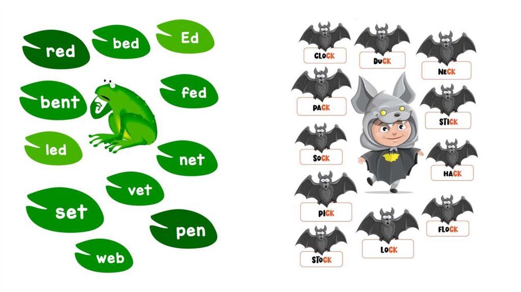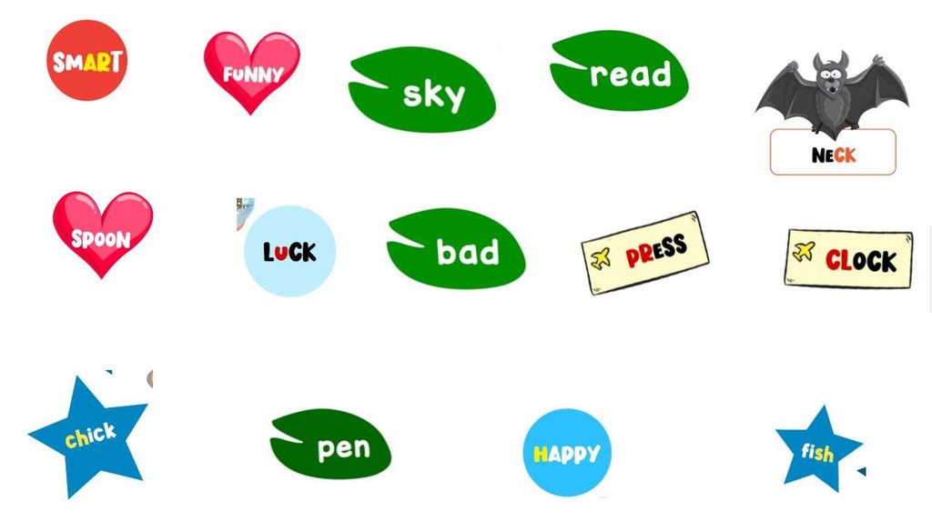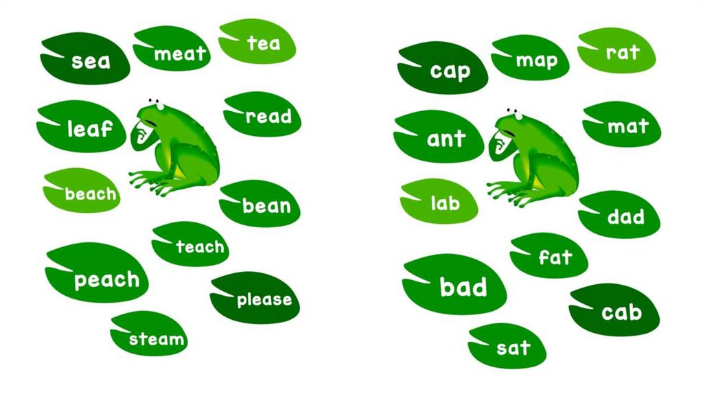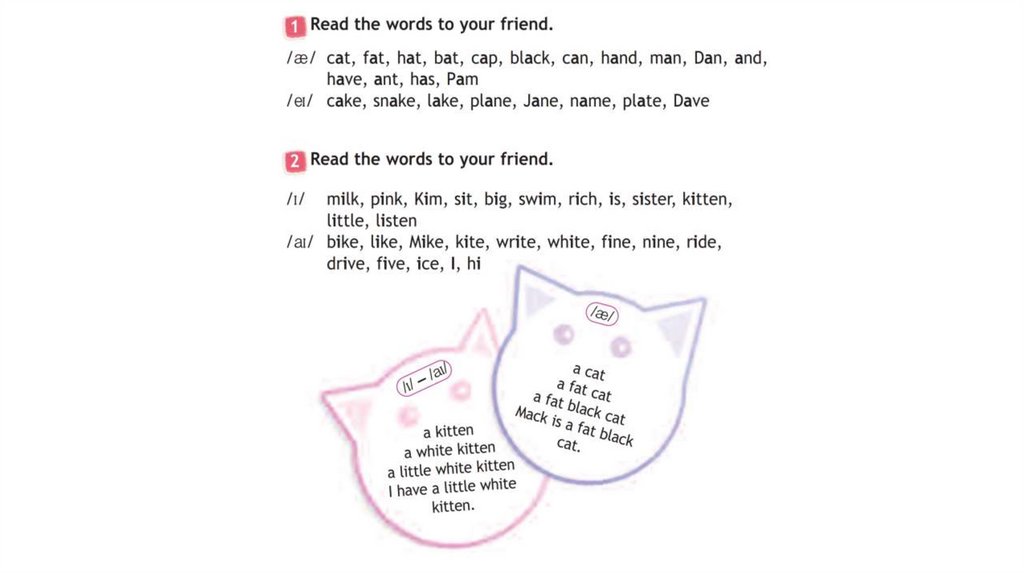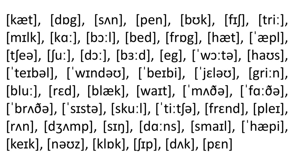 [kæt], [dɒg], [sʌn], [pen], [bʊk], [fɪʃ], [triː],[mɪlk], [kɑː], [bɔːl], [bed], [frɒg], [hæt], [ˈæpl],