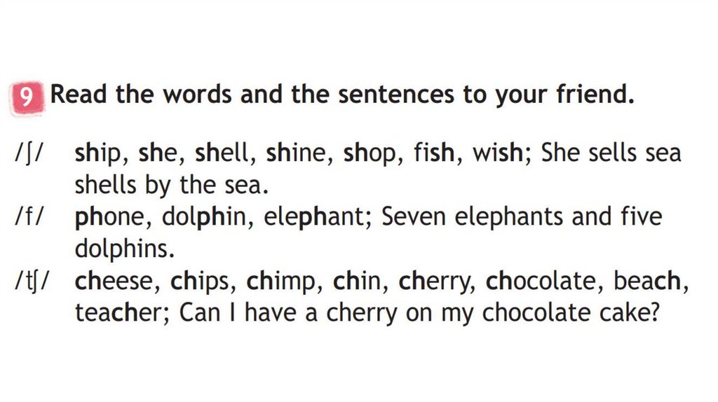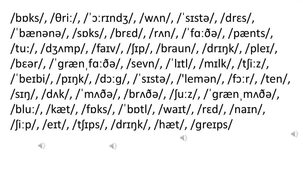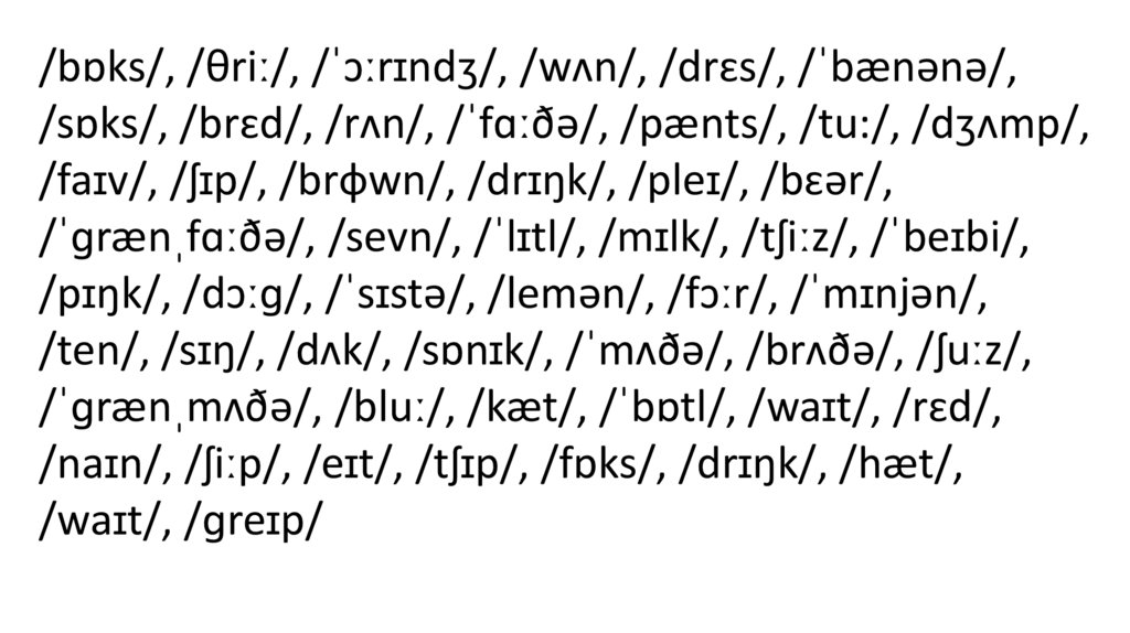 /faɪv/, /ʃɪp/, /brфwn/, /drɪŋk/, /pleɪ/, /bɛər/,