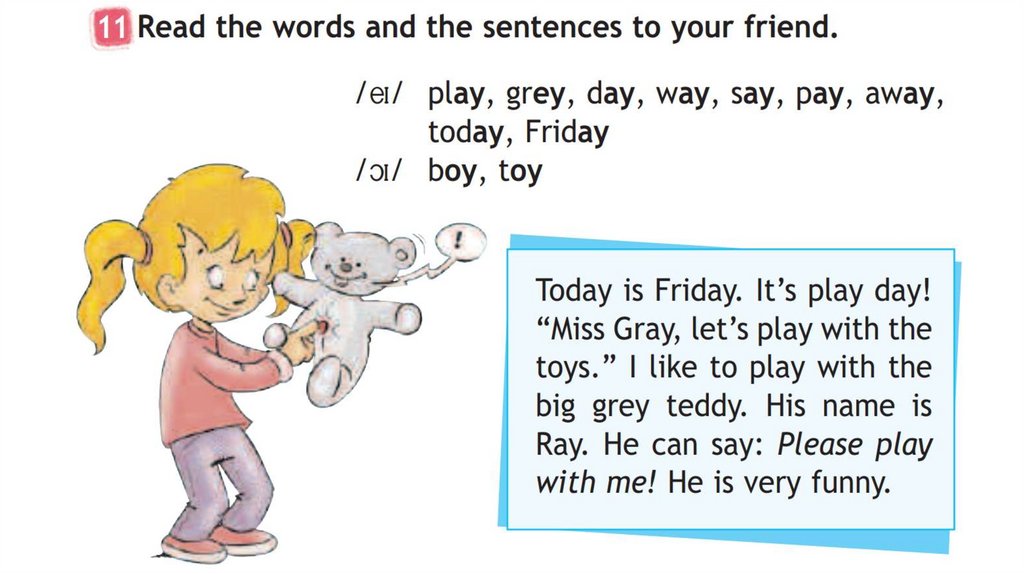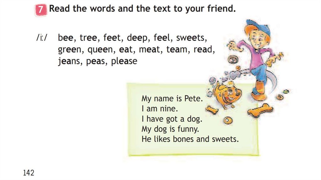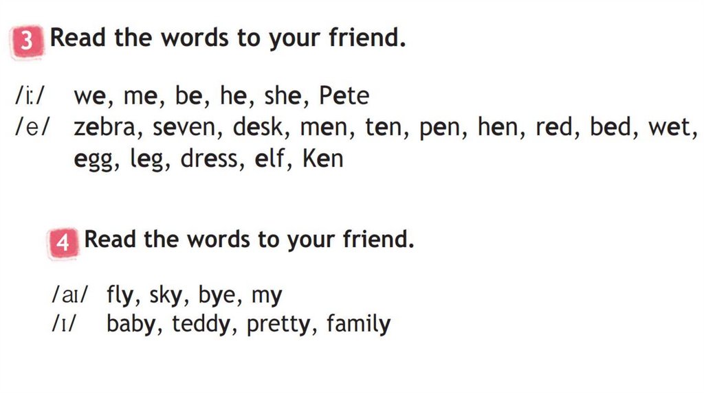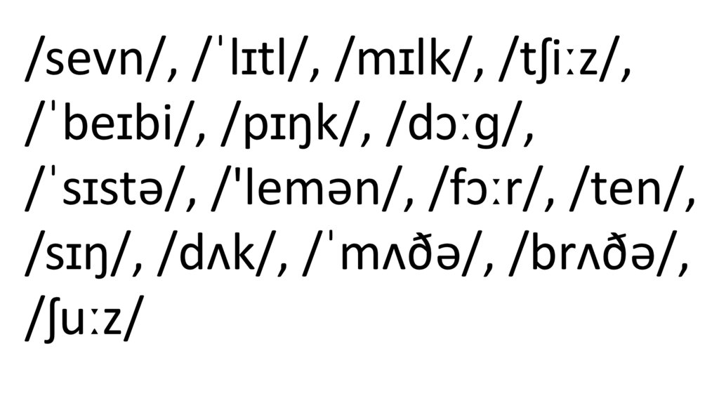 /sevn/, /ˈlɪtl/, /mɪlk/, /tʃiːz/,/ˈbeɪbi/, /pɪŋk/, /dɔːɡ/,