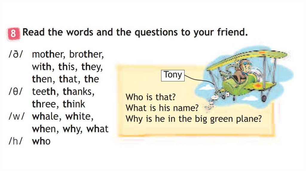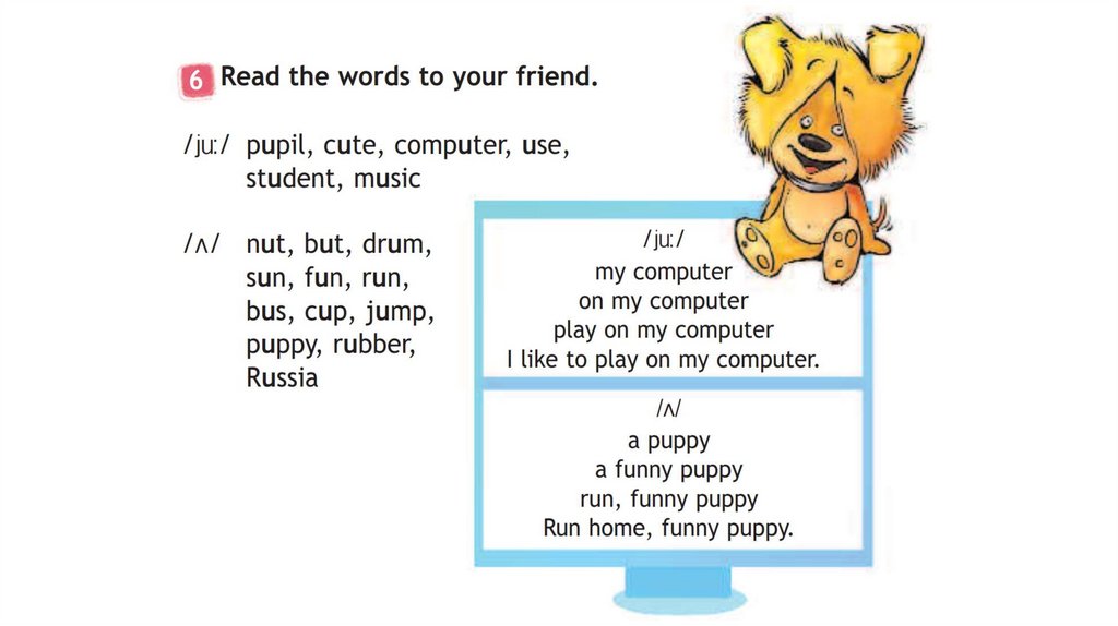 /tu:/, /dʒʌmp/, /faɪv/, /ʃɪp/, /braun/, /drɪŋk/, /pleɪ/,