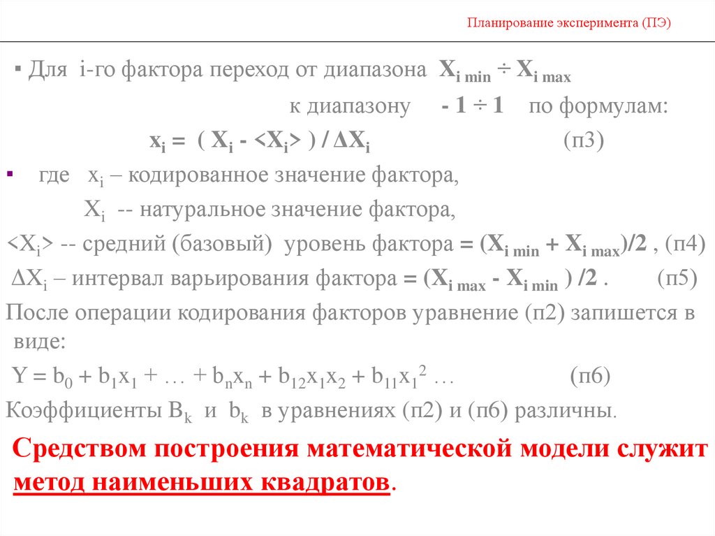 ▪ Для i-го фактора переход от диапазона Xi min ÷ Xi maxк диапазону - 1 ÷ 1 по формулам: