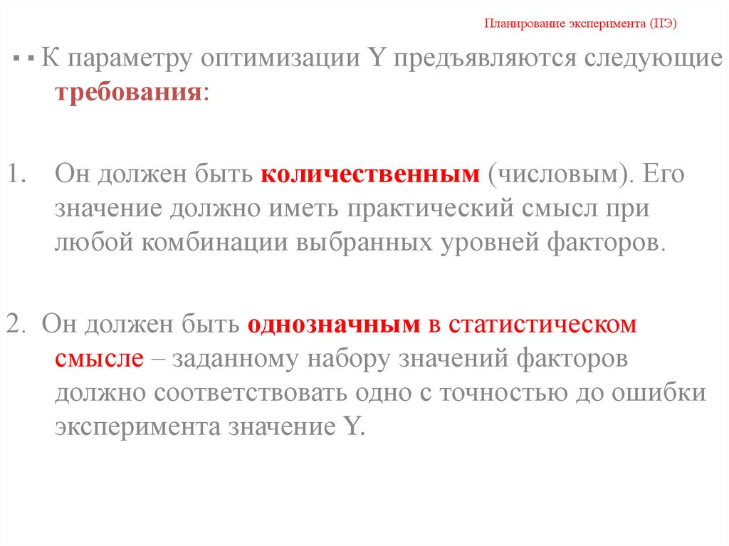 ▪ ▪ К параметру оптимизации Y предъявляются следующиетребования: