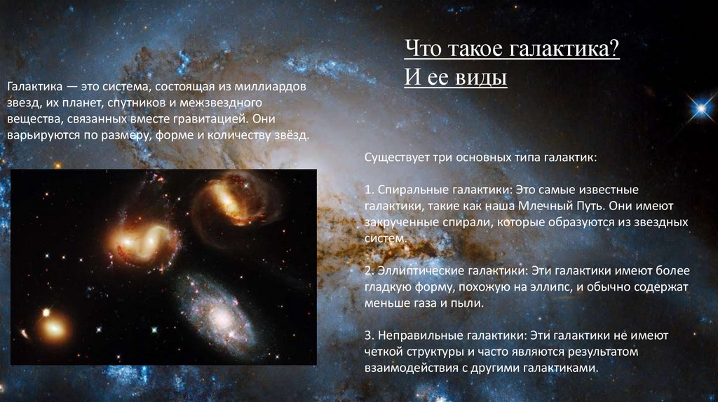 Галактика — это система, состоящая из миллиардовзвезд, их планет, спутников и межзвездного