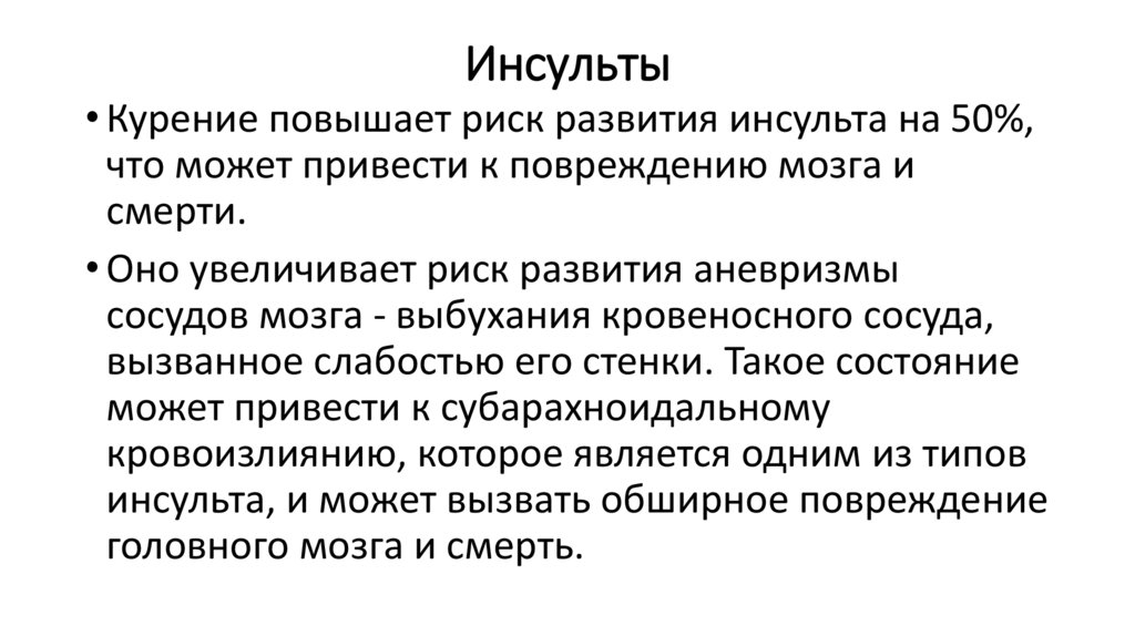 • Курение повышает риск развития инсульта на 50%,что может привести к повреждению мозга и