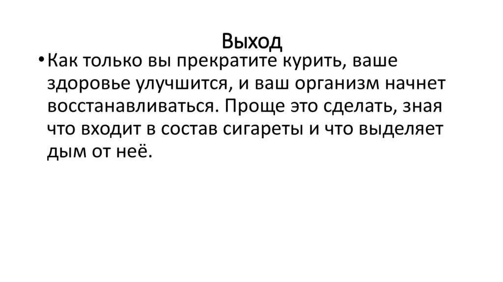 • Как только вы прекратите курить, вашездоровье улучшится, и ваш организм начнет
