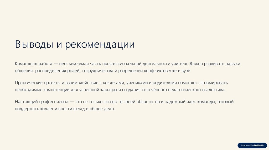 Выводы и рекомендацииКомандная работа — неотъемлемая часть проф ессиональной деятельности учителя. Важно развивать навыки