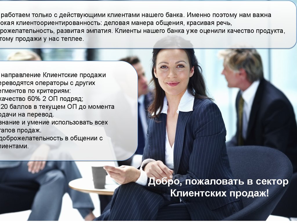 работаем только с действующими клиентами нашего банка. Именно поэтому нам важнасокая клиентоориентированность: деловая манера общения, красивая речь,
