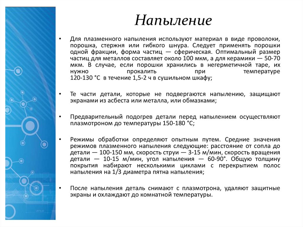 детали — 10-15 м/мин, угол напыления — 60-90°. Общую толщину