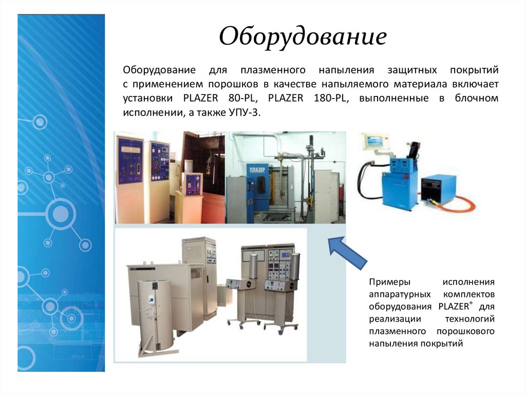 Оборудование для плазменного напыления защитных покрытийс применением порошков в качестве напыляемого материала включает