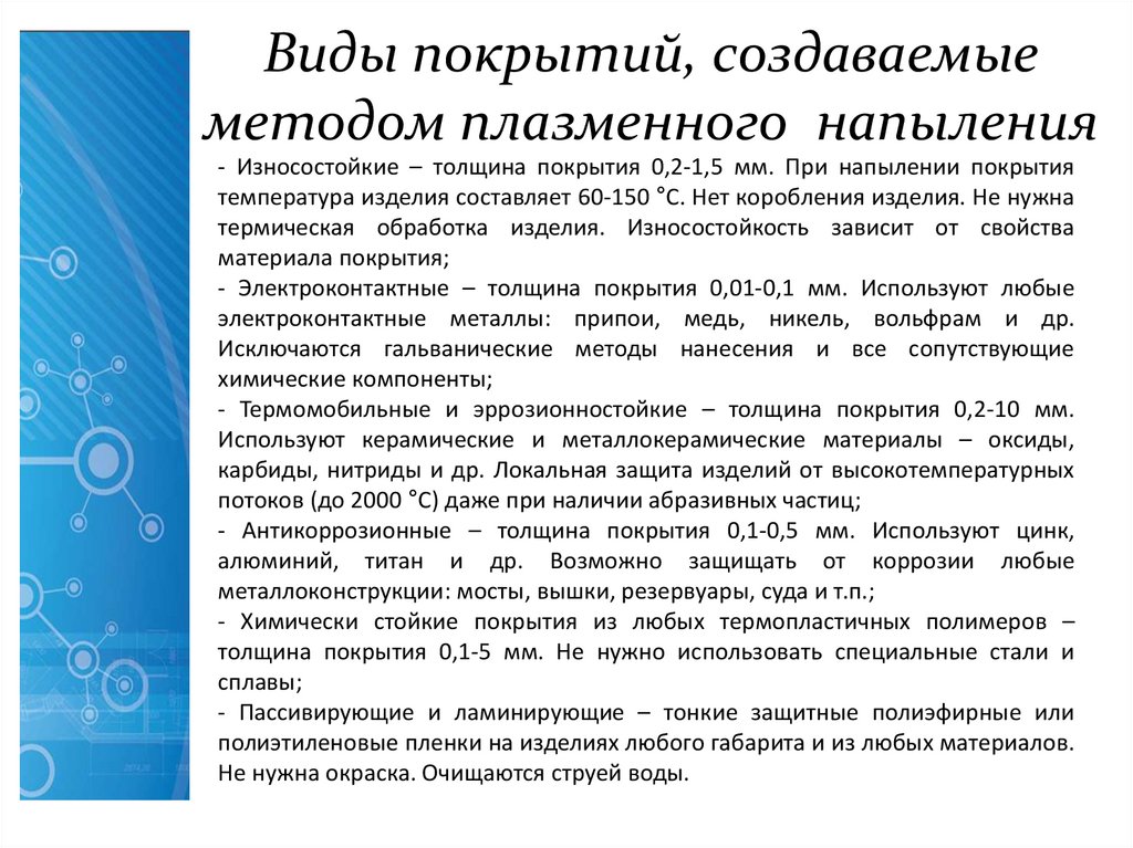 Виды покрытий, создаваемыеметодом плазменного напыления