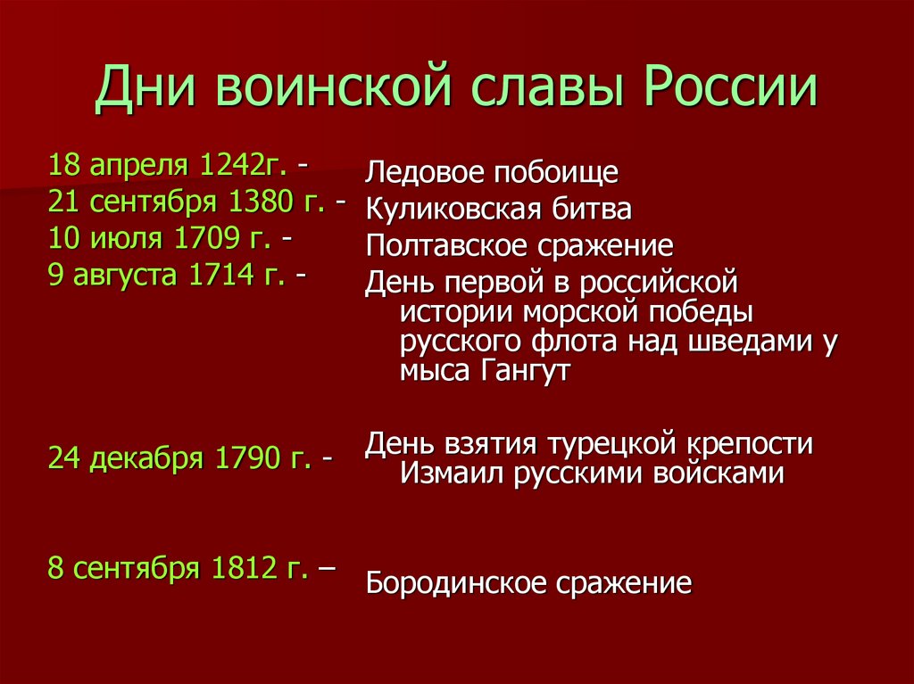 18 апреля 1242г. Ледовое побоище21 сентября 1380 г. - Куликовская битва