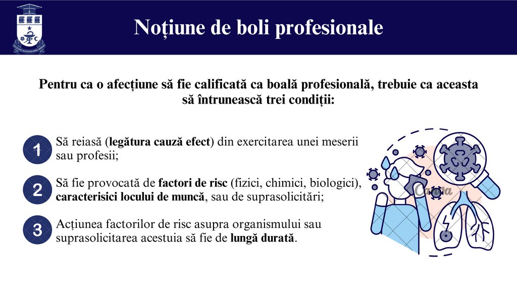 Noţiune de boli profesionalePentru ca o afecțiune să fie calificată ca boală profesională, trebuie ca aceasta