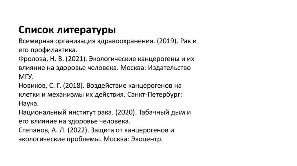Список литературыВсемирная организация здравоохранения. (2019). Рак и