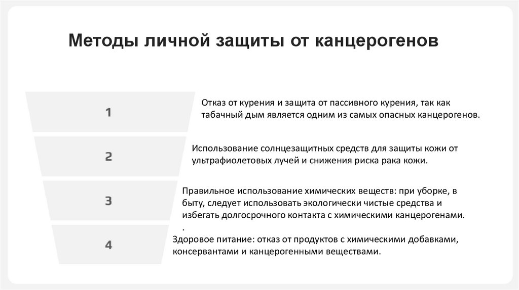 Методы личной защиты от канцерогеновОтказ от курения и защита от пассивного курения, так как