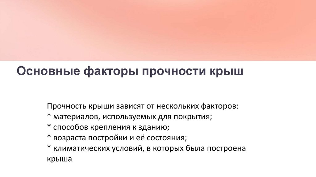 Основные факторы прочности крышПрочность крыши зависят от нескольких факторов: