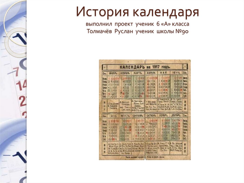 1. История календаря выполнил проект ученик 6 «А» класса Толмачёв Руслан ученик школы №9o