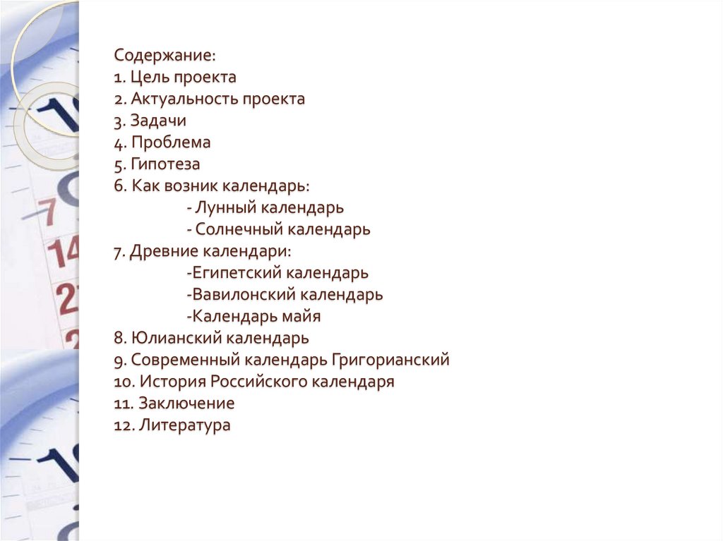 2. Содержание: 1. Цель проекта 2. Актуальность проекта 3. Задачи 4. Проблема 5. Гипотеза 6. Как возник календарь: - Лунный